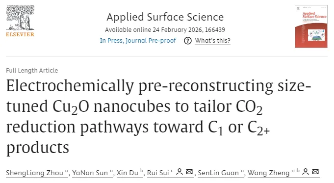 近日,我院王政教授团队在《Applied Surface Science》期刊发表题为“Electrochemically pre-reconstructing size-tunedCu2O nanocubes to tailor CO2reduction pathways toward C1or C2+products”的研究论文,23级硕士研究生周生亮为论文第一作者。